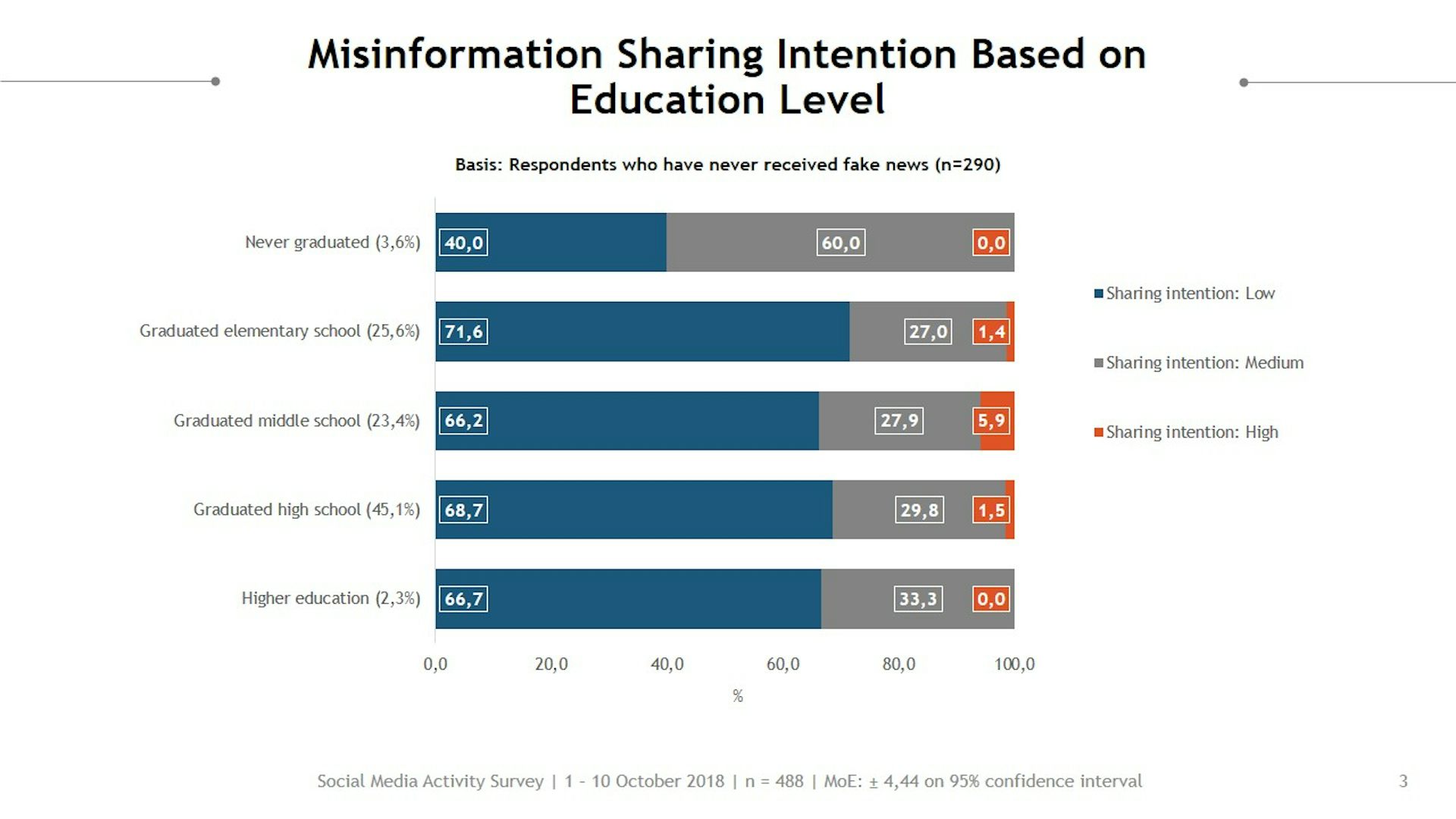 Religious factors play a role, too. Our survey shows that people with weak religious belief tend to share fake news more. However, this data can be biased – Indonesians tend to answer positively to questions about their religion.