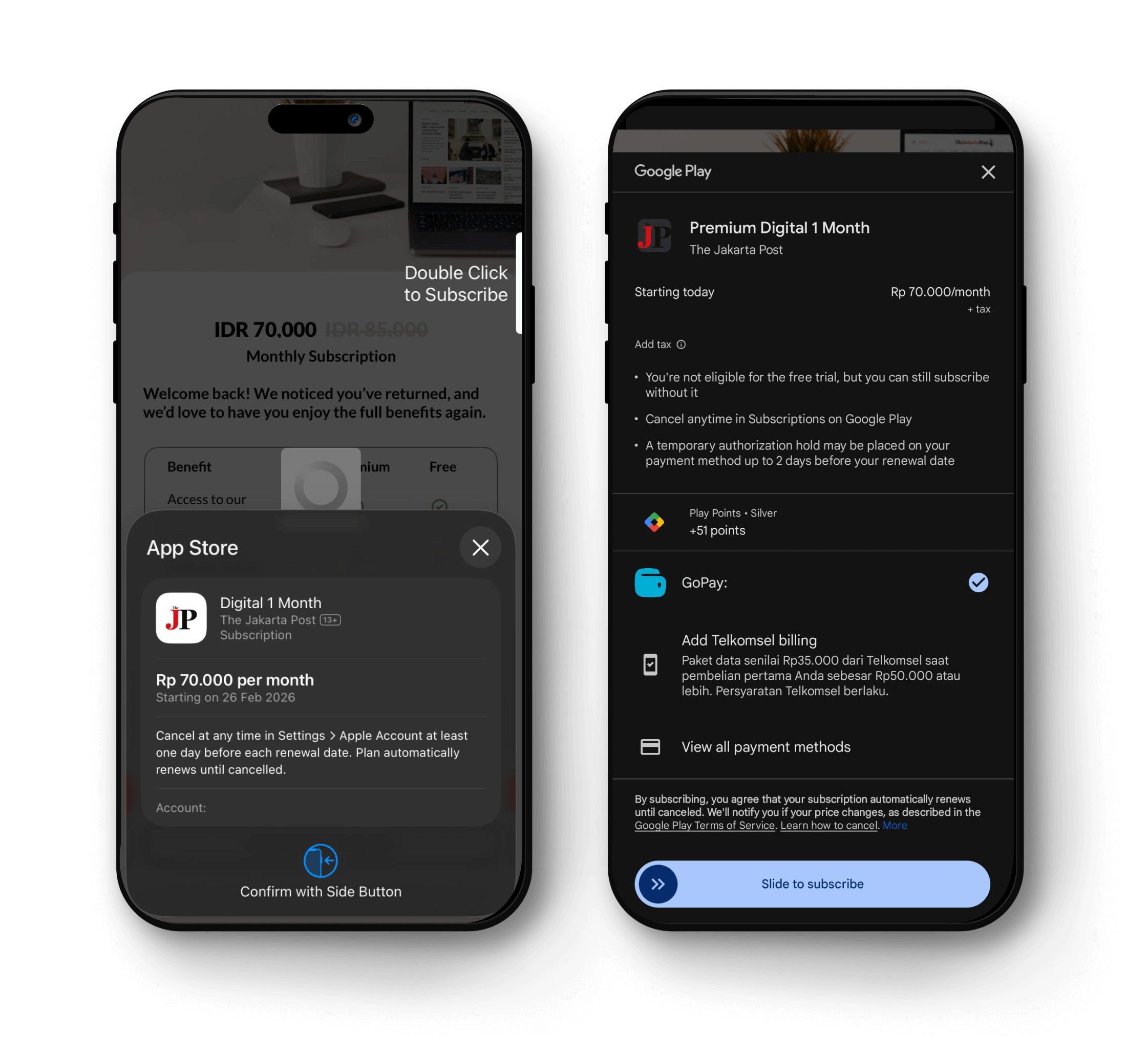 Subscribe easily with The Jakarta Post's automatic renewal subscription system, works with Google and Apple pay.
