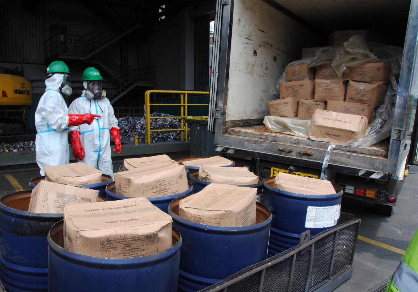 Workers wearing personal protective equipment prepare to destroy cardboard boxes containing shrimp contaminated with radioactive materials on Nov. 15, 2025, at PT Prasadha Pamunah Limbah Industri (PPLI) in Klapanunggal, Bogor, West Java. The Environment Ministry has destroyed 5.7 tonnes of shrimp contaminated with the radioactive isotope Cesium-137 (Cs-137) from Cikande in Serang, Banten, through a gradual incineration process. (Antara/Arif Firmansyah)