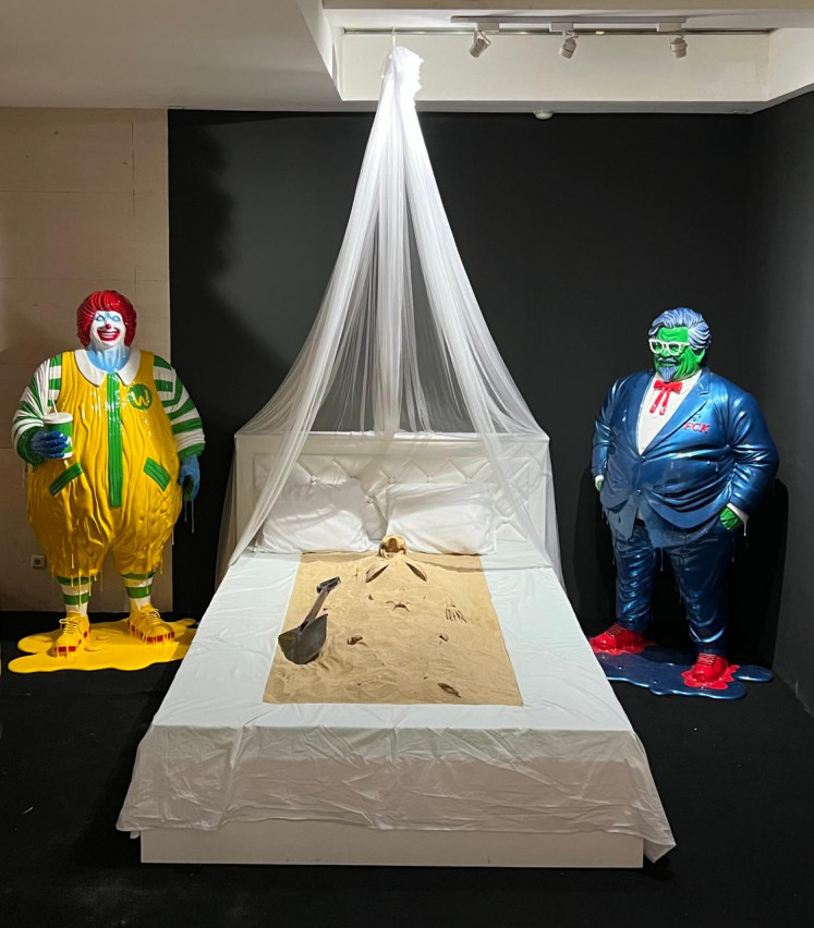 Syakiep Sungkar, who was born in 1962 and was once an entrepreneur and art collector, presents Tribute to Junkfood, a six-by-eight-meter installation where a skeleton lies on a plush bed guarded by two fast-food mascots. Initially humorous, the scene soon turns unsettling: a darkly comic elegy for a society overfed yet spiritually starved.