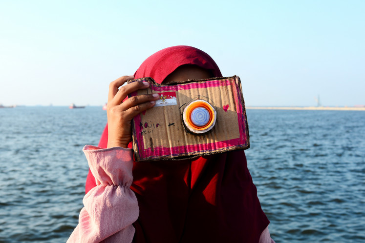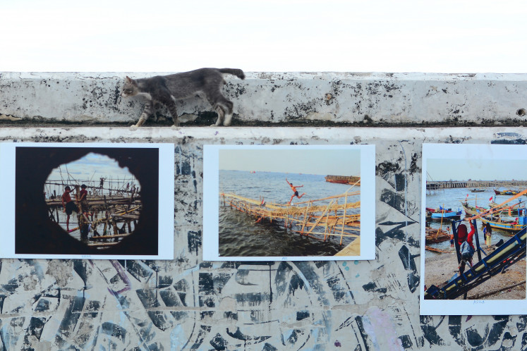 Everyday focus: A cat walks along a concrete embankment displaying photographs on Sunday as part of the INFINITI: Imajinasi dan Fantasi Sejak Dini (Infinity: Imagination and fantasy from an early age) exhibit in Cilincing, North Jakarta. Running from Oct. 31 to Nov. 2, the exhibit was the culmination of a four-month volunteer program called Kelas Jurnalis Cilik (young journalists class), a photography and empowerment initiative for children who live in the coastal district. (JP/Iqro Rinaldi)During the first three months of Kelas Jurnalis Cilik, the young participants focused on theory, learning from photographers and journalists who volunteered their time to share professional knowledge and techniques. The final month was devoted to practice, finally culminating in the public exhibition to highlight their learning journey.