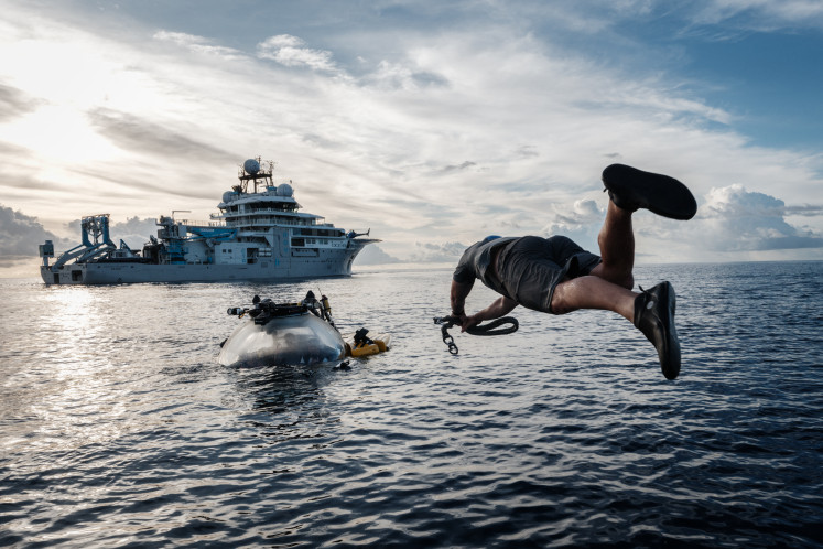 This photo taken on January 9, 2026 shows the crew of the OceanXplorer, a research vessel operated by the marine non-profit OceanX, jumping into the sea from a boat to swim toward a surfaced submersible and attach a recovery line in the waters off Sulawesi island. A dome-fronted submersible sinks beneath the waves off Indonesia, heading nearly 1,000 metres down to the realm of purple-frilled corals and bioluminescent shrimp. This month, AFP boarded one of two submersibles belonging to OceanX, a non-profit founded by billionaire Ray Dalio and his son that works with scientists on its OceanXplorer ship to study the marine world. (AFP/Yasuyoshi Chiba)'So little we know'
