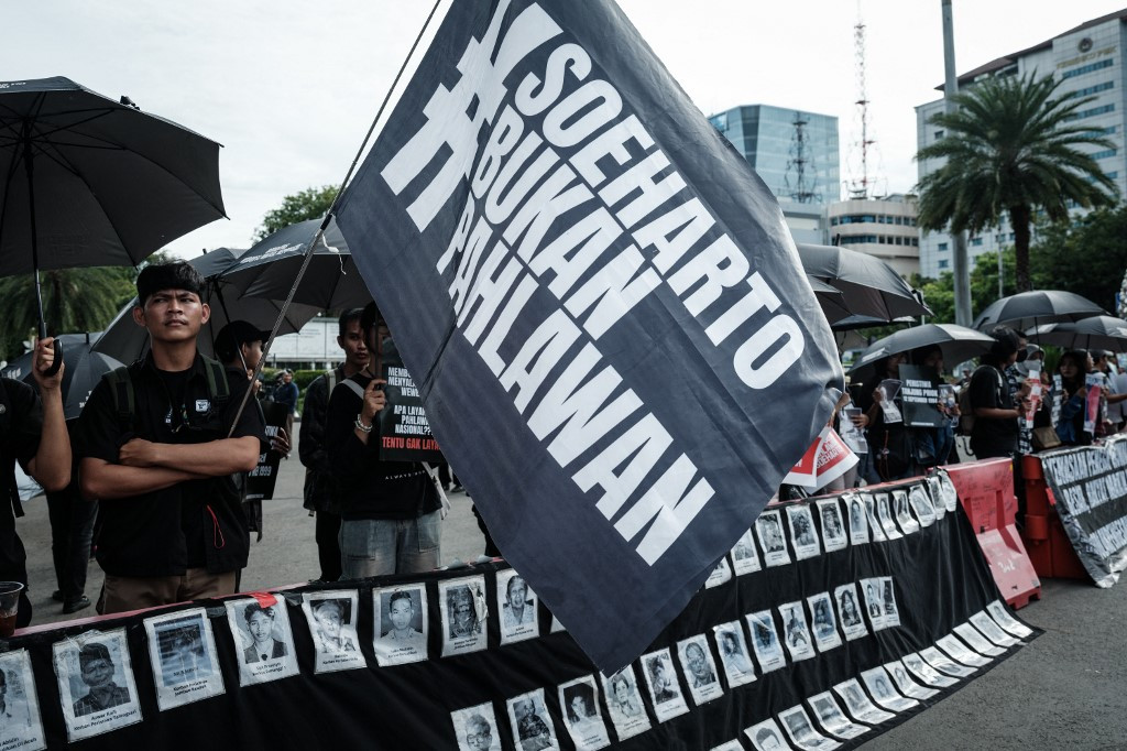 A member of a civil society group ('left') holds a banner that reads “Suharto is not a hero“ during the 'Kamisan' (Thursday) rally on Nov. 6, 2025, opposing the government's plan to give former president Soeharto the title of national hero, near the presidential palace in Jakarta. Suharto, who died in 2008 aged 86, ruled Indonesia with an iron fist for more than three decades after seizing power in 1967. (AFP/Yasuyoshi Chiba)