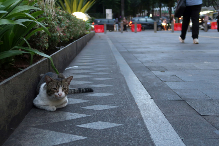 In front of the FX Sudirman shopping mall, a gray-and-white tabby shifts positions, yawns and slow-blinks, its paws tucked neatly beneath its body. Other cats living around the mall hide in the bushes or nibble from bowls placed near the pedestrian entrance stairs. But the star of the area is a ginger cat, playful, plump and unbothered, who roams confidently around the mall as if it were his personal estate.