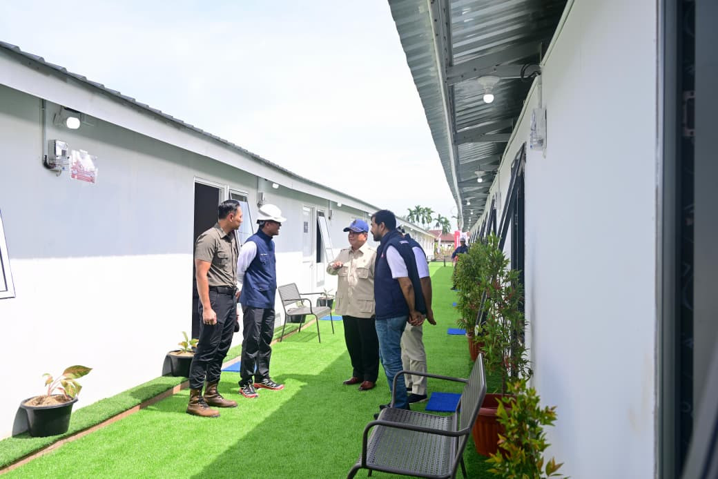 President Prabowo Subianto (center) speaks to Coordinating Infrastructure and Regional Development Minister Agus Harimurti Yudhoyono (left), State-Owned Enterprises (SOEs) Regulatory Agency head Dony Oskaria (second left) and state asset fund Danantara CEO Rosan Roeslani (second right) and Aceh Governor Muzakir Manaf during an inspection on Jan. 1 of a temporary housing site for residents affected by floods and landslides in Aceh Tamiang regency, Aceh. (Courtesy of Presidential Secretariat/Rusman)