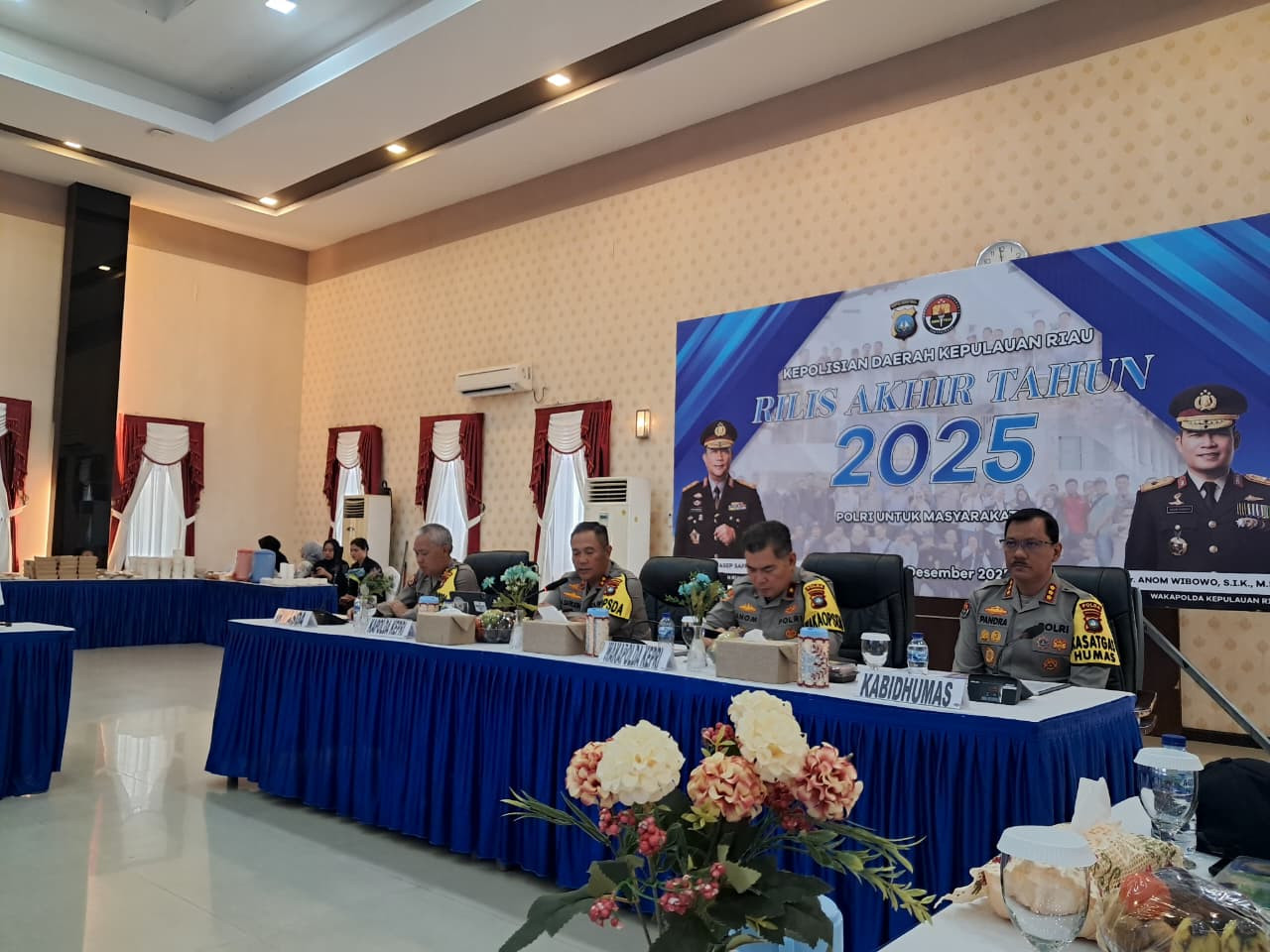 Riau Islands Police chief Insp. Gen. Asep Safrudin (second left) delivers a speech on Dec. 30, 2025, during a year-end press conference at the provincial police headquarters in Batam, Riau Islands. Asep highlighted cooperation with police forces of Singapore and Malaysia to maintain security in border areas. (JP/Fadli)
