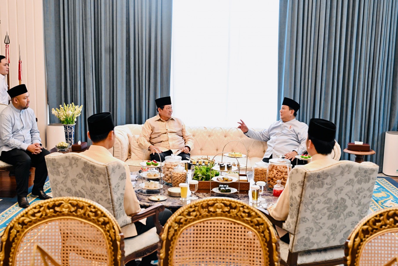 President Prabowo Subianto (right, rear), accompanied by his son Ragowo “Didit” Hediprasetyo (left, seated), speaks with former president Susilo Bambang Yudhoyono (center) on Saturday, during a private meeting on the sidelines of the Idul Fitri open house at the Merdeka Palace in Central Jakarta. (Presidential Secretariat/Laily Rachev)