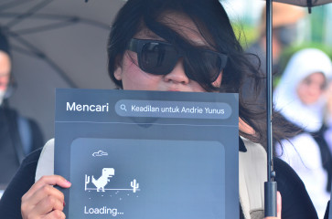 Dig deeper: A human rights activist affiliated with the Justice for Victims Solidarity Network holds a poster on April 9, 2026, during the 903rd “Kamisan” protest across from the Merdeka Palace in Jakarta. The demonstrators urged the formation of a joint fact-finding team to uncover the details of the acid attack on activist Andrie Yunus. (JP /Iqro Rinaldi)