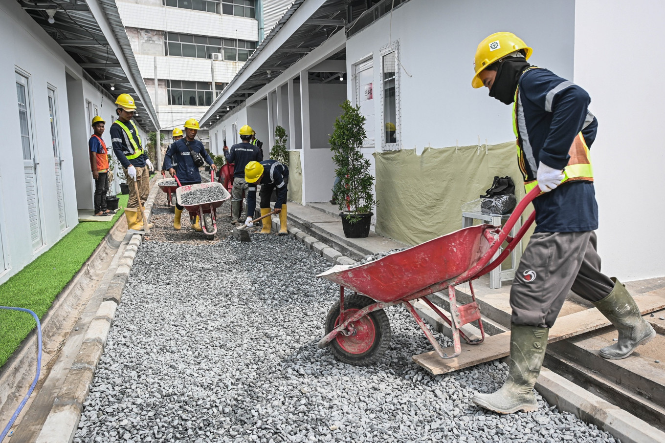 Workers pave a walkway to a housing project with pebbles on April 23 in Senen, Jakarta. The Public Housing and Settlements Ministry will build 324 housing units with public bathrooms, 'musholla' (prayer rooms) and kitchens for squatters who lived along the railway track in the area. (Antara/Sulthony Hasanuddin)
