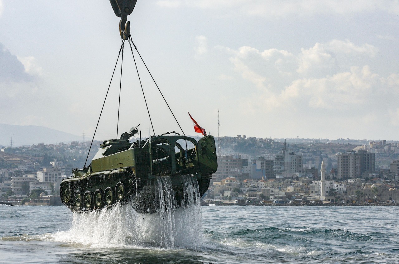 Environmental activists drop off an old mechanised armoured personnel carrier provided by the Lebanese Armed Forces into the Mediterranean Sea, about three kilometres off the coast of the southern Lebanese port city of Sidon, on July 28, 2018, to create new habitat for marine life. (AFP/Mahmoud Zayyat)