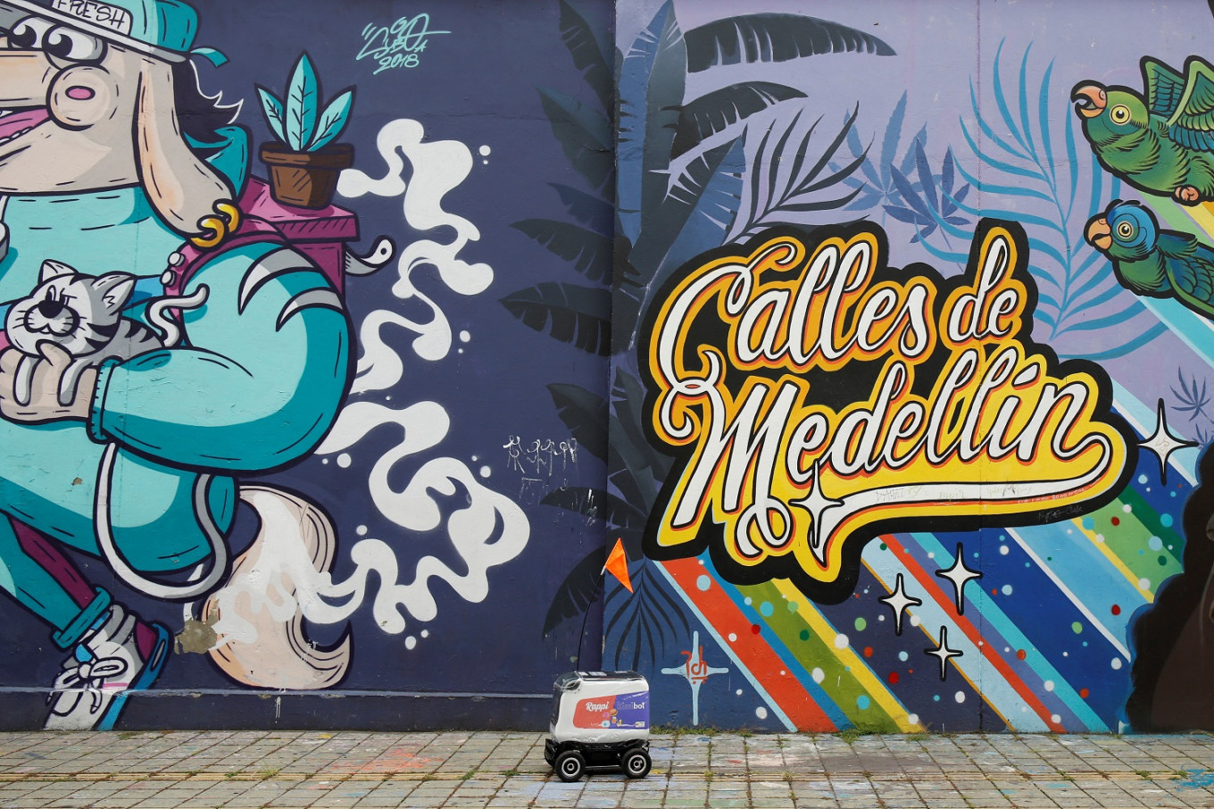 The pilot started this week in Medellin, Colombia's second-largest city. The boxy robots, which travel on four wheels and are decked with orange flags on their antennae, carry deliveries of up to 35 square centimeters and are used to transport restaurant orders paid for digitally.