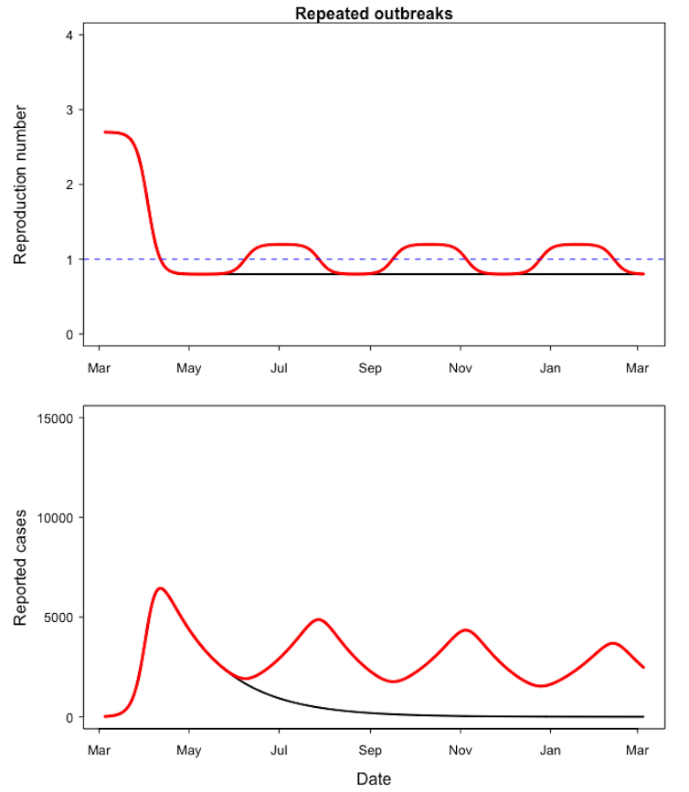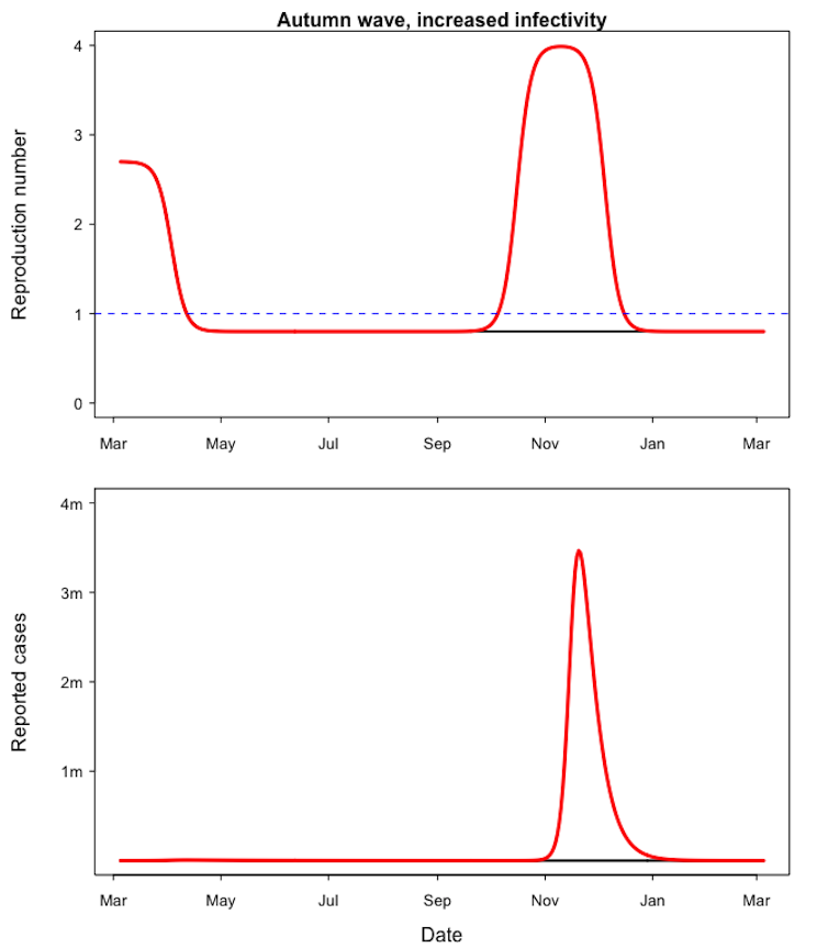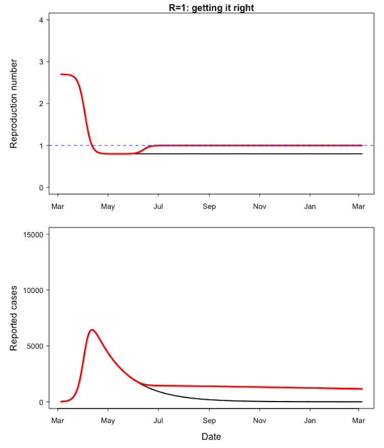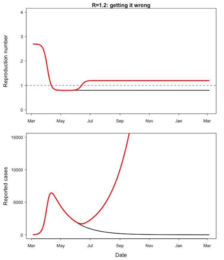 But even a relatively modest change of R to 1.2 would result in a large outbreak causing the second wave, demonstrating how important it is to get the control measures right.