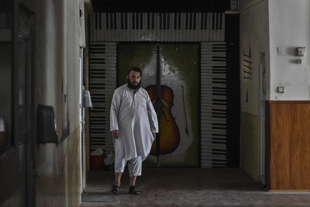 This photo taken on September 14, 2021 shows a member of the Taliban walking in a corridor at the Afghanistan National Institute of Music in Kabul. The Taliban, who banned music outright during their brutal and oppressive rule from 1996 to 2001, have promised a more moderate brand of rule this time -- though they have made clear that they will run Afghanistan within the restrictive limits of their interpretation of sharia law. This photo taken on September 14, 2021 shows a member of the Taliban walking in a corridor at the Afghanistan National Institute of Music in Kabul. The Taliban, who banned music outright during their brutal and oppressive rule from 1996 to 2001, have promised a more moderate brand of rule this time -- though they have made clear that they will run Afghanistan within the restrictive limits of their interpretation of sharia law. (AFP/Wakil Kohsar)