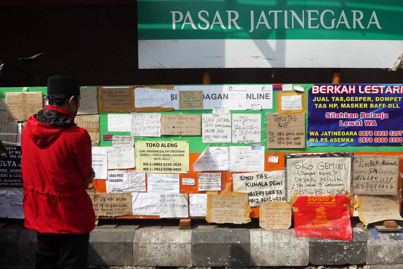 A visitor looks at a merchant information board on May 15 at East Jakarta’s Jatinegara Market, which is temporarily closed due to the city’s large-scale social restrictions. The board contains the phone numbers of market merchants who have continued to offer their services. JP/Dhoni Setiawan