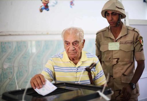 Restoring stability -- In this Monday, May 26, 2014 file photo, an Egyptian soldier watches a voter cast his ballot in the presidential election in Cairo, Egypt. A new-old idea is rattling around the Middle East five years after the Arab Spring caused stirrings of democratic ambition: that a restoration of security, especially if accompanied by some economic and political reforms, should be enough for the moment. (AP/Mostafa Elshemy, File)