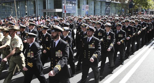 Members of the armed forces march in the annual Australia and New Zealand Army Corps (ANZAC) parade in Sydney, Australia, Monday, April 25, 2016. A teenager was charged with plotting a terrorist attack on an Australian Veteran's Day ceremony, police said Monday, the second year in a row authorities say they have thwarted an attack linked to the national holiday. (AP/Rob Griffith)