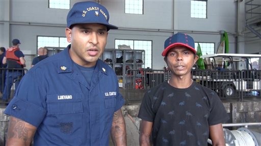In this Wednesday, May 4, 2016 image taken from video, Petty Officer 2nd Class Simey Luevano, left, translates a statement from an unidentified mariner, right, after he was rescued at sea more than 2,000 miles southeast of Hawaii. The Colombian man survived a two-month ordeal in the Pacific by eating fish and seagulls, the US Coast Guard said. (US Coast Guard via AP/-)