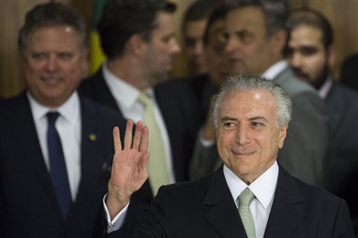 "Our biggest challenge is to staunch the process of freefall of our economy," Temer said at a swearing-in ceremony Thursday for his 22 Cabinet ministers. "First of all, we need to balance our public spending. The sooner we are able to balance our books, the sooner we'll be able to restart growth."