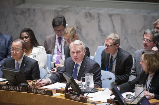In this photo provided by the United Nations, Jean-Marc Ayrault, center, Minister for Foreign Affairs and International Development of France, addresses the United Nations Security Council, on June 10, 2016 at United Nations headquarters. U.N. Secretary-General Ban Ki-moon is seated to his left and Hasmik Egian, Acting Director of the Security Council Affairs Division, is to the right. Ayrault addressed a small group of reporters on Friday, warning that Israel's ban on Palestinians entering its territory following the "abominable" attack on a popular cafe in Tel Aviv could escalate violence instead of focus attention on the need to pursue peace. (The United Nations via AP/Rick Bajornas)