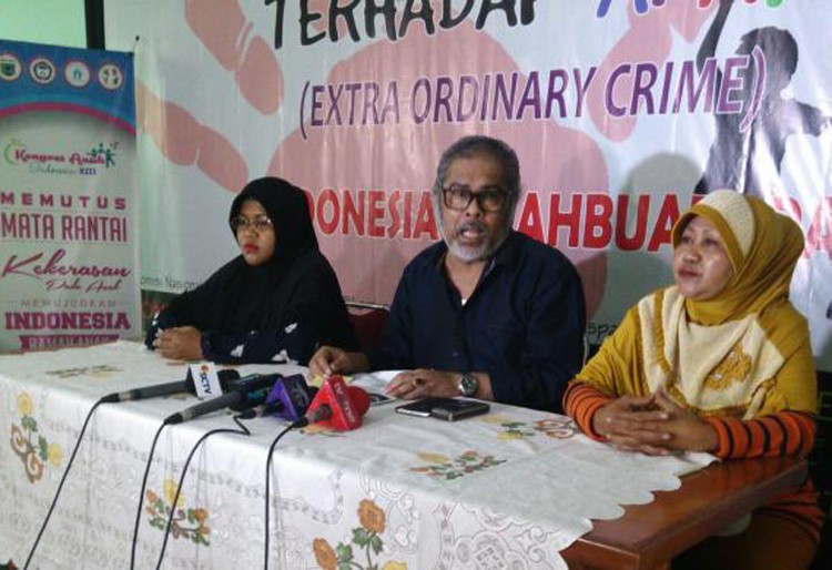 Raudiah Elva Ningsih (left) and her mother Kursia (right), accompanied by the chairman of the National Commission for Child Portection (Komnas PA), Arist Merdeka Sirait, speak to journalists about her alleged missing baby at the Komnas PA office on Monday. Raudiah had reported her missing baby to the police.
