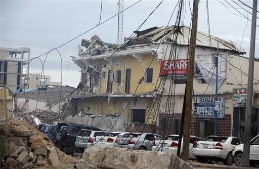 A view of the Nasahablod Hotel, destroyed after a bomb attack in Mogadishu, Somalia, on June 25, 2016. A Somali police officer says a suicide car bomber detonated an explosives-laden vehicle at the gate of a hotel in Mogadishu followed by gunmen who were fighting their way into the hotel. (Associated Press/Farah Abdi Warsameh)
