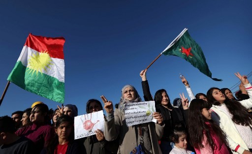 Syrian Kurds wave the Kurdish flag and flags bearing the logos of the People's Protection Units (YPG) Women's Protection Units (YPJ) as they chant slogans in the northern Iraqi city of Arbil, the capital of the autonomous Kurdistan region, during a demonstration on February 2, 2018 against the military operation by the Turkish army against the Kurdish YPG forces in Syria's Afrin.