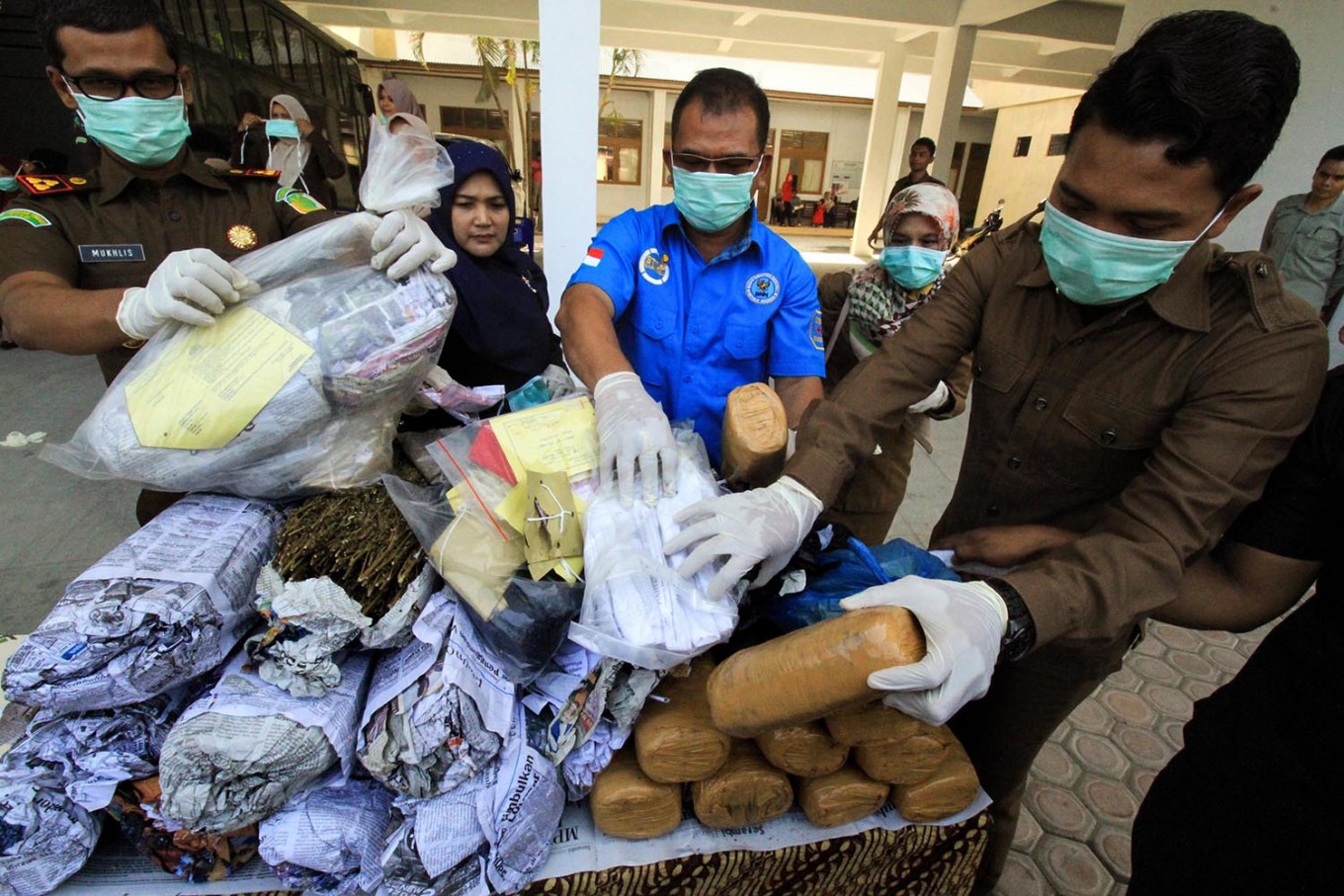 Ablaze: A joint team comprising police officers and personnel of the Lhokseumawe Prosecutor's Office, the Lhokseumawe District Court and the National Narcotics Agency (BNN) pile packages of marijuana that will be burned in an event at the Lhokseumawe Prosecutor's Office in Aceh on Feb.13. (Antara/Rahmad)