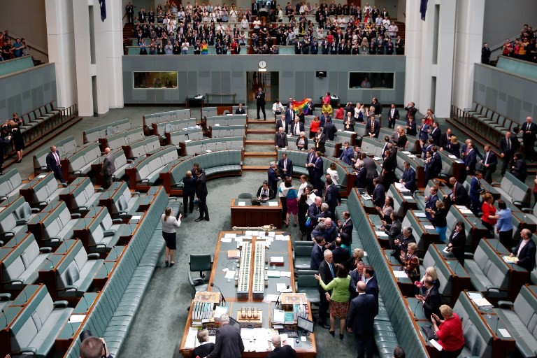 Lawmakers react after the Same-Sex Marriage Act was passed in the Federal Parliament in Canberra on December 7, 2017. Gay couples will be able to legally marry in Australia after a same-sex marriage bill sailed through parliament on December 7, ending decades of political wrangling.