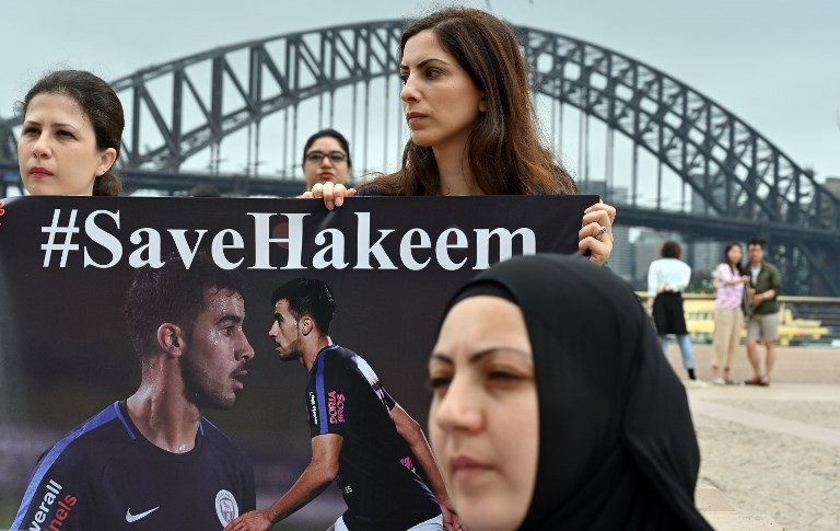 Human rights groups and the Australian football community hold a protest in front of the Opera House for the release of refugee footballer Hakeem Alaraibi in Sydney on January 10, 2019. Alaraibi, who plays for a semi-professional football club in Melbourne, was stopped by Thai immigration on November 27, 2018 after arriving in Bangkok for a vacation with his wife.