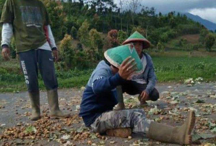 Videos of the protest action on Saturday have spread fast through social media. The footage shows farmers empty several sacks of potatoes and cabbage onto roads and trample on the produce. The action was staged near the agribusiness terminals in the regency.