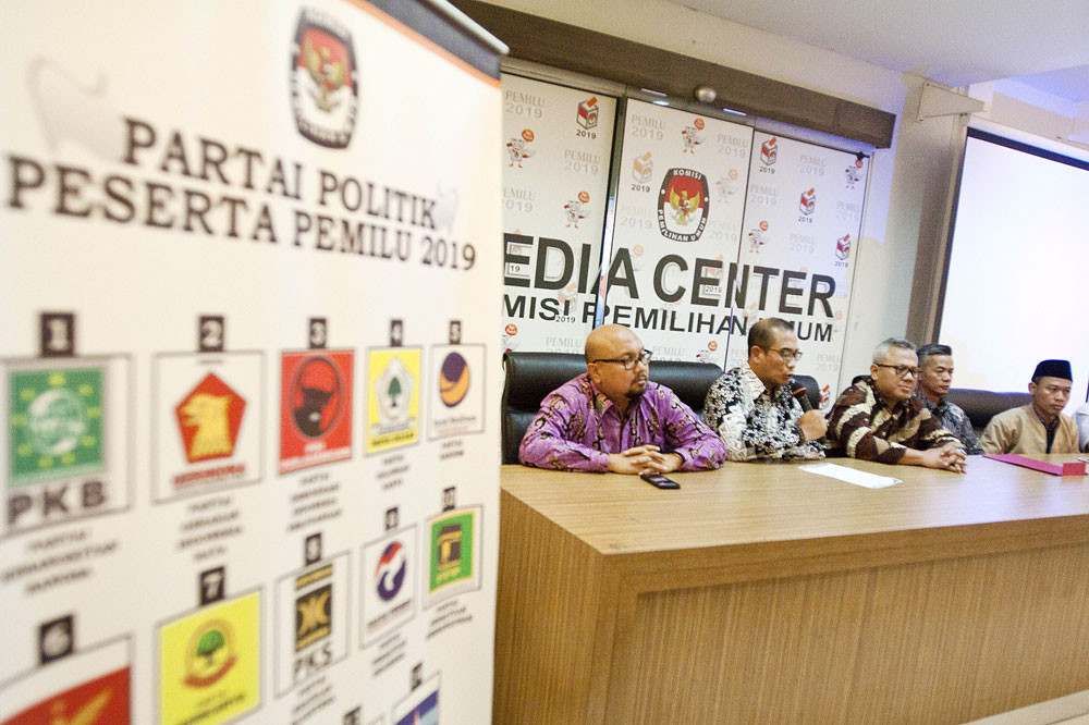 General Elections Commission (KPU) chairman Arief Budiman (middle) insists on Wednesday that the KPU could not allow Hanura Party chairman Oesman Sapta Odang to run for a seat on the Regional Representatives Council (DPD) if he does not resign from his position at Hanura. The statement was issued in response to the Elections Supervisory Agency's (Bawaslu) recent demand that the KPU include Oesman on the legislative candidacy list. (Antara/Galih Pradipta)