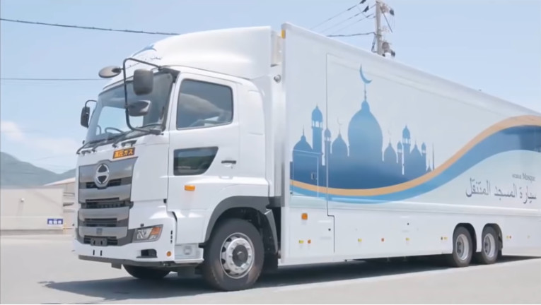 The back of the modified truck can be widened in seconds and the vehicle also includes Arabic signage and outdoor water taps for pre-worship cleaning.