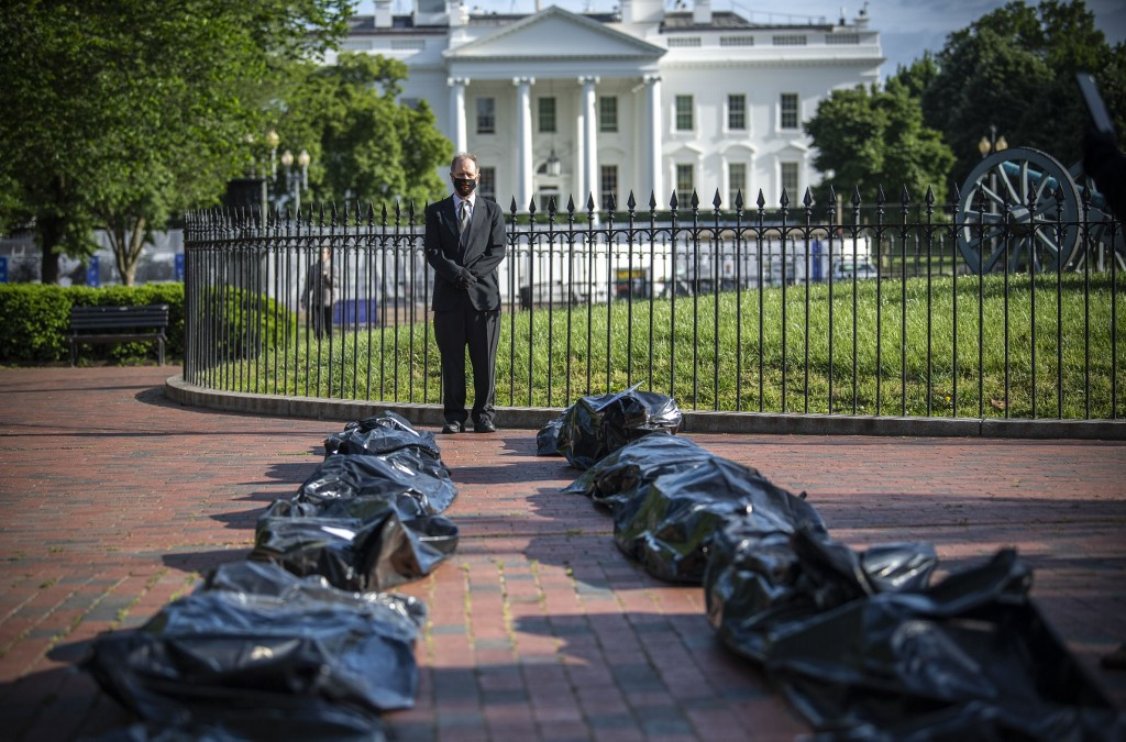 Demonstrators display fake body bags during a protest in front of the White House in Washington, DC, on May 20, 2020.The US capital is relaxing lockdown restrictions following a sustained period of decreased coronavirus infections, Washington's mayor said Wednesday, announcing that restaurants and other businesses can reopen under social distancing guidelines. (AFP/Eric BARADAT )