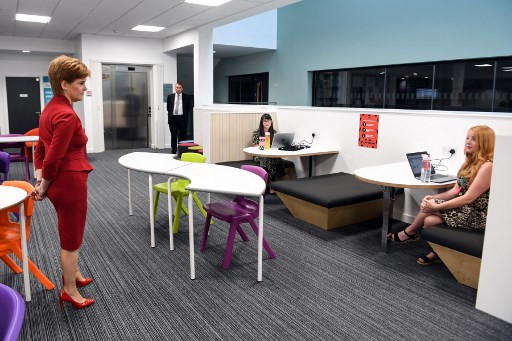 First Minister of Scotland Nicola Sturgeon visits West Calder High School in West Calder, Scotland on August 10, 2020 to see preparations ahead of pupils returning later this week after a four-month shutdown to combat the spread of the novel coronavirus. - Scotland's schools will start reopening on August 11 after a more than four month long shutdown sparked by the global novel coronavirus pandemic. (Pool/AFP/Andy Buchanan)