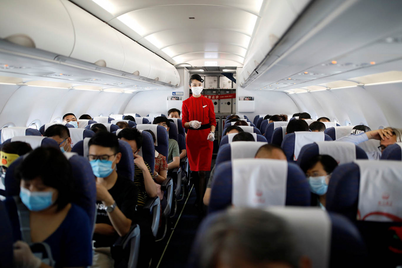 A flight attendant wearing a face mask and gloves following the coronavirus disease (COVID-19) outbreak walks past passengers inside a Sichuan Airlines aircraft before the flight takes off from Xichang Qingshan Airport in Xichang, Sichuan province, China June 16, 2020. (REUTERS/Carlos Garcia Rawlins)