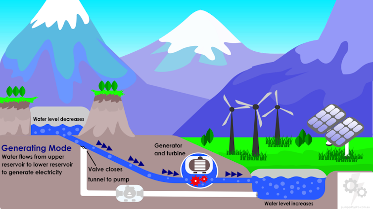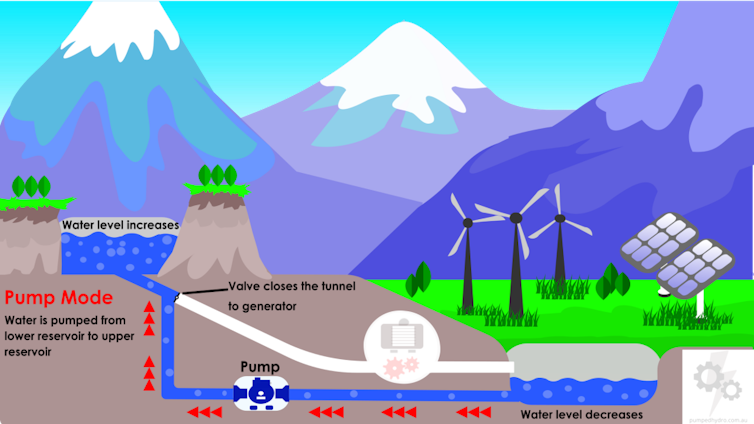 PHES is a technique to store energy by using excess power produced from solar panels during sunny days to pump water uphill to a higher reservoir. When power generation is low during cloudy weather or at night, electricity can then be dispatched on demand from PHES by releasing the stored water downhill to the lower reservoir through the turbine.