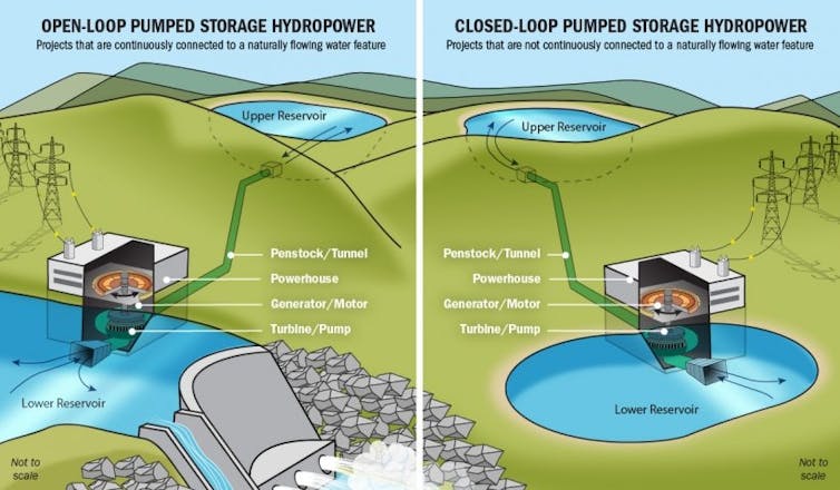 Two types of pumped-storage hydropower: river-based (left) and off-river (right).