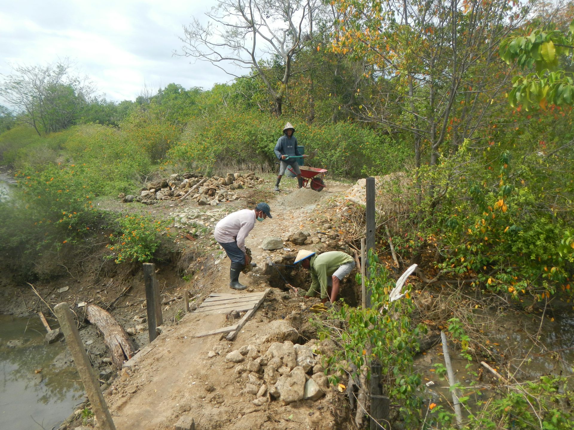 Restoring mangroves requires human labour and machinery, as in this image of villagers in Sulawesi improving water flow and drainage into disused shrimp ponds. Rio Ahmad - Director of Yayasan Hutan Biru