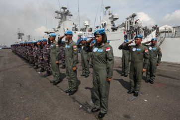 International duty: Indonesian Navy personnel grouped under the Maritime Task Force (MTF) KONGA XXVIII-O/UNIFIL TA 2023 attend a send-off ceremony on Dec. 6, 2023, at the Second Fleet Command headquarters in Surabaya, East Java. They will join the international peacekeeping force in Lebanon. (Antara/Didik Suhartono)