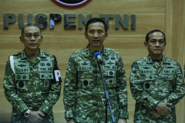 Indonesian Military (TNI) spokesperson Maj. Gen. Aulia Dwi Nasrullah (center), accompanied by TNI Police Headquarters (Puspom) commander Maj. Gen. Yusri Nuryanto (left) and TNI legal division chief Rear Adm. Farid Ma'ruf (right), speaks to journalists on March 25, 2026, during a press briefing at the TNI's headquarters in Cilangkap, East Jakarta. During the press briefing, Aulia announced the resignation of TNI Strategic Intelligence Agency (BAIS) chief Lt. Gen. Yudi Abrimantyo amid the investigation into BAIS linked personnel for the acid attack against Andrie Yunus in Jakarta on March 12. (Antara/Asprilla Dwi Adha)