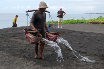 A foreign tourist watches a farmer pour seawater onto sandy fields during a traditional salt production process on Dec. 3, 2025, in Klungkung, Bali. According to local farmers, an average of 5-10 foreign tourists visit the traditional salt production site each day to observe the process and buy salt, which is sold for Rp 20,000 (US$1.20)-Rp 40,000 depending on amount. (Antara/Nyoman Hendra Wibowo)