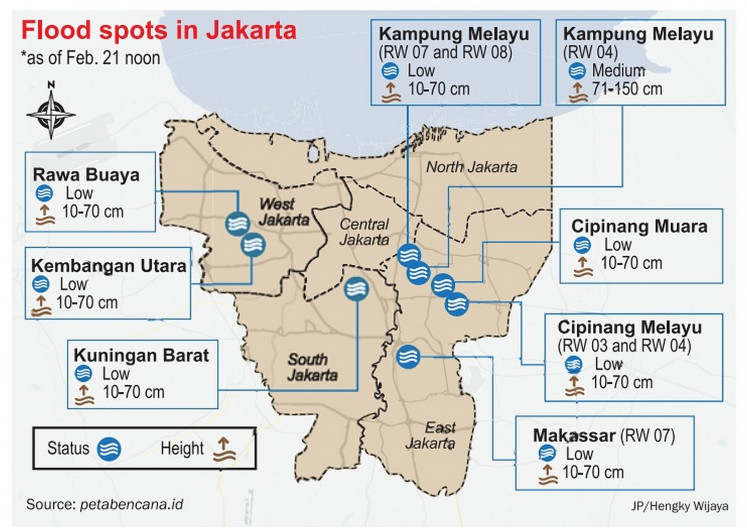 According to the provincial administration flood monitoring website pantaubanjir.jakarta.go.id, Cipinang Melayu subdistrict in Makasar district, East Jakarta, was among the worst hit areas as the floodwater reached depths of 2.5 m.