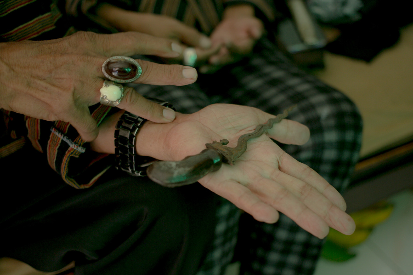 Gofur then took out a handkerchief, making a knot at the end, while waving in all directions with his eyes closed. The four of them each lit a cigarette and blew smoke into the air. With their hands raised towards the sky, the four of them chanted a Javanese spell loudly in unison.