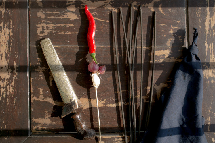 Gofur doesn't need many tools in the ritual of driving out the rain. The most important are the kris, handkerchief, incense, and lombok-onion pierced by a stick (JP/Ivan Darski) (JP/Ivan Darski)“There's a myth that rain handlers lose their 'ability' when they cross the ocean. But I proved that even when I was outside Indonesia my job went well,” said Gofur, who has cast out the rain for various beach parties abroad, including in the United States. “My principle is anywhere I am, I am standing on God's earth. As long as I am in a place created by God, I think my ability will remain effective.”