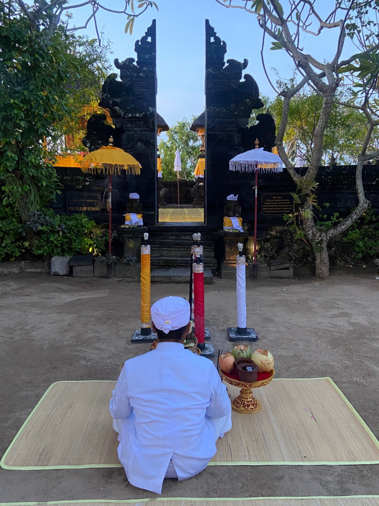 The sun was setting when Four Seasons Jimbaran’s resort-priest Ajik Ngurah began praying before the hotel’s temple on July 14. Five fire poles, covered with a fabric of different colors, and Balinese offerings laid in front of him.