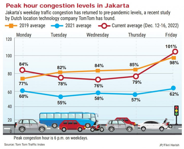 While the Jakarta Transportation Agency was quick to pat itself on the back when the TomTom Traffic Index showed that the capital’s congestion level in 2021 was 34 percent, down from 36 percent in 2020 and 53 percent in 2019, recent data shows that the pandemic was largely to thank for the decrease.
