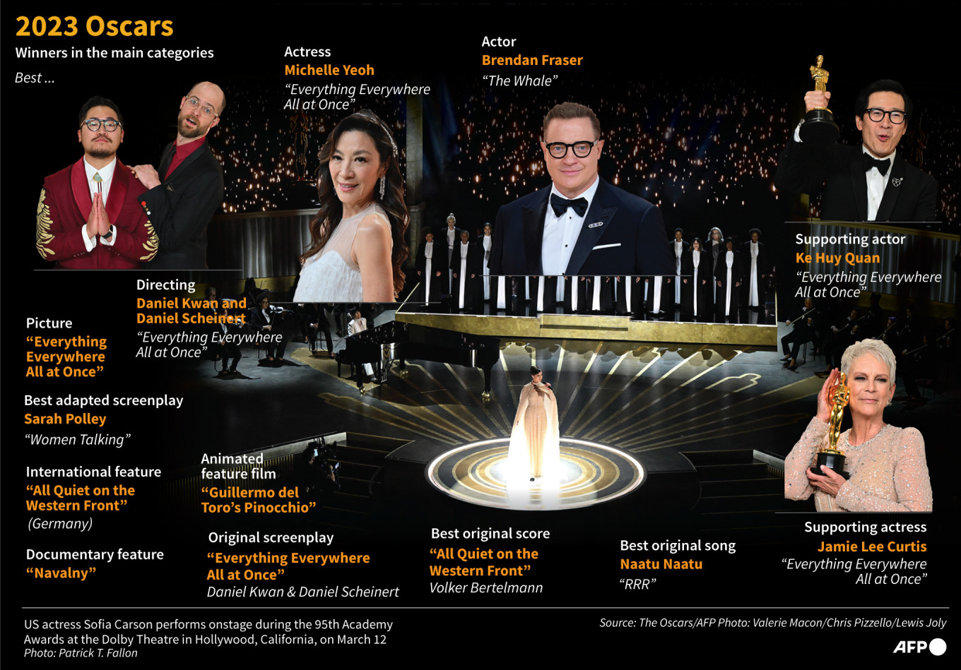urreal sci-fi film Everything Everywhere All at Once dominated the Oscars on Sunday, winning seven golden statuettes including best picture, Hollywood's most-coveted prize.