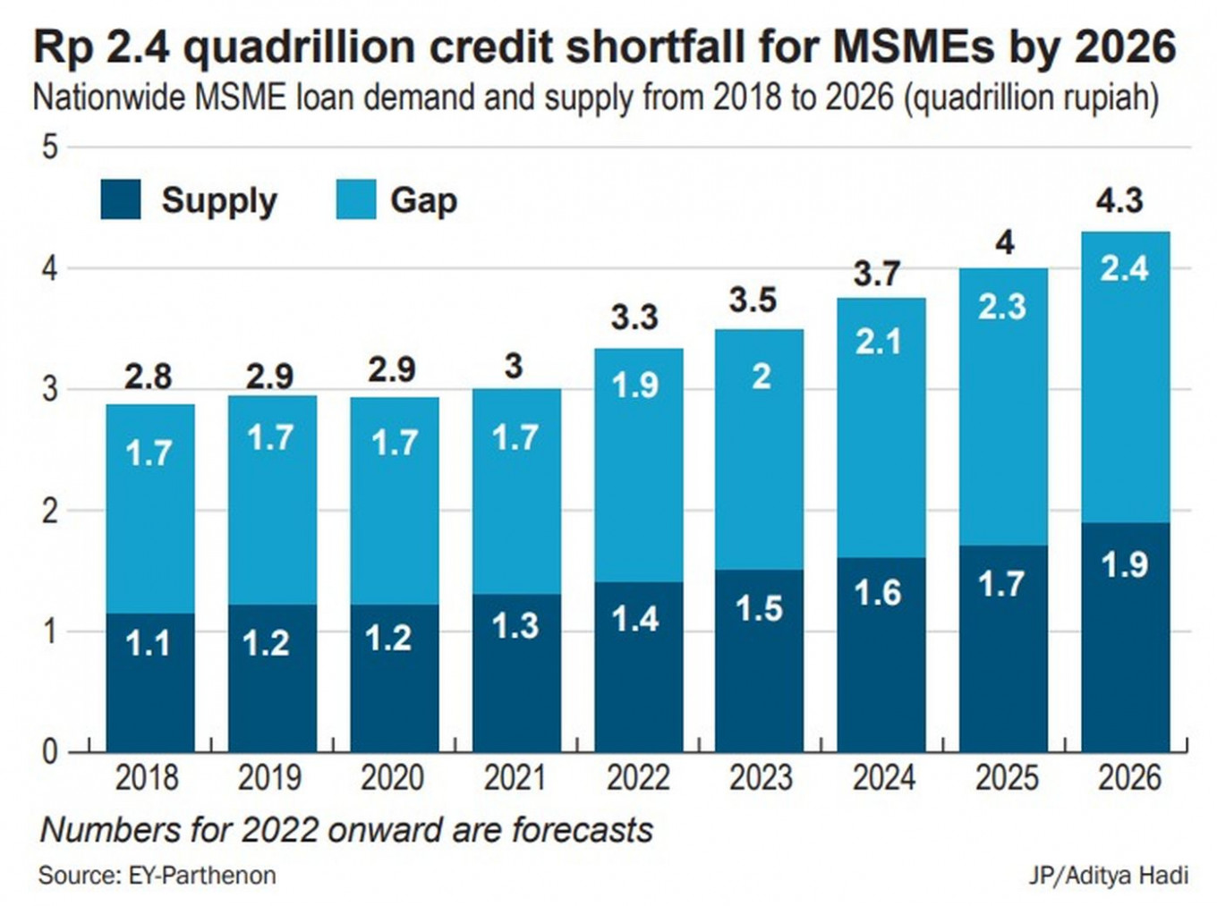 A recent study by Ernst & Young (EY) Indonesia's consultancy arm, EY-Parthenon, predicts that loan demand from MSMEs in the country will rise to Rp 4.3 quadrillion by 2026, which may result in a loan gap of Rp 2.4 quadrillion.