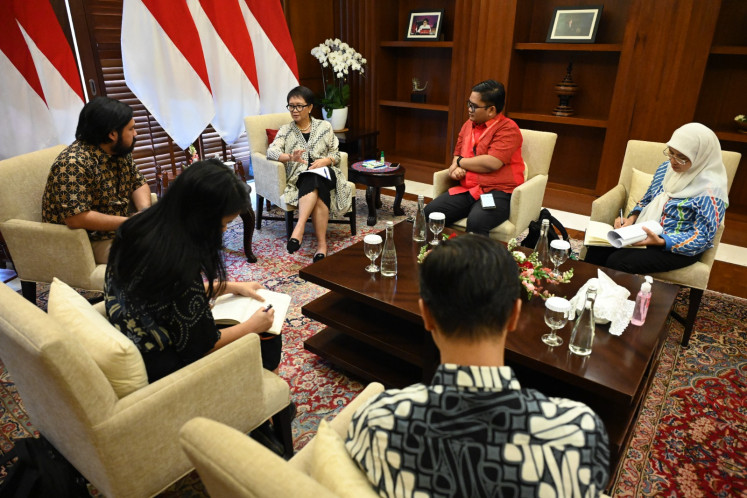 Foreign Minister Retno LP Marsudi (second left, in background), speaks to journalists from The Jakarta Post at her office in Jakarta on Aug. 30, 2023, ahead of the 43rd ASEAN Summit. (Courtesy of Foreign Ministry/-)To improve collective efforts, guarantee continuity and sustain the progress made thus far, the minister suggests forming a troika of ASEAN chairs and empowering its envoys and the secretariat to bolster the current special envoy mechanism.