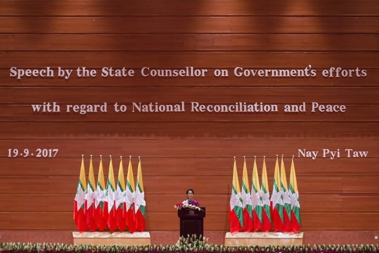 Suu Kyi skipped this week's UN General Assembly in New York to manage the crisis at home and deliver her televised address -- the biggest yet of her time in office.